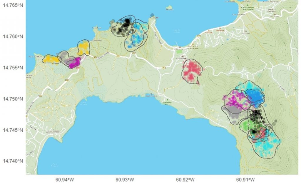 En avril-mai 2025, l’analyse du suivi par télémétrie de 16 femelles de mangoustes localisées sur deux sites, Pointe Rouge (n = 9) et Morne Pavillon (n = 11) a montré que, leur domaine vital couvre une surface moyenne de 10 ha, variant fortement entre individus (de 3 à 23 ha). Par ailleurs, la densité en Rats noirs sur Pointe Rouge et sur Morne Pavillon, réestimée lors de cette session, était assez faible < 10 rats/ha, confirmant les fortes fluctuations interannuelles chez cette espèce dans ces habitats tropicaux.