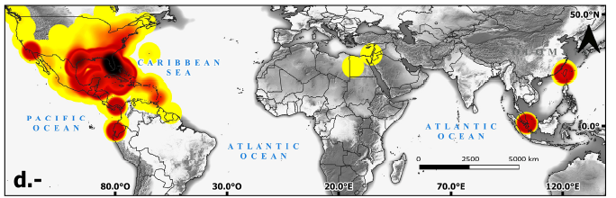 2.Distribution globale de A. sagrei. Les zones en rouge et en jaune indiquent les régions aux plus fortes concentrations d’occurrences (Kernel Density map)(Romero et al., 2024)