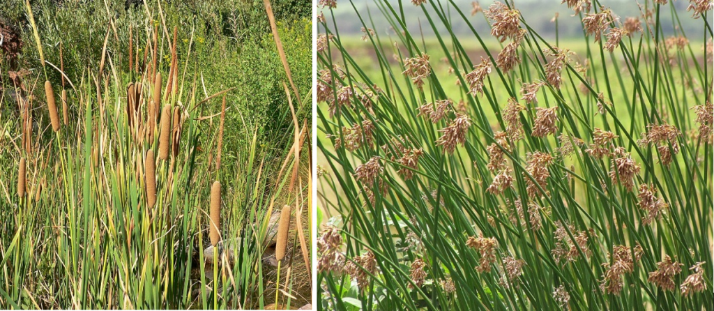 Figure 2 : Typha domingensis (à gauche, crédits : Stan Shebs, CC BY-SA 3.0) et Schoenoplectus californicus (à droite, crédits : Forest & Kim Starr, CC BY 3.0 US)