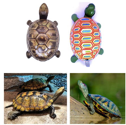 Un exemple d’intégration culturelle d’EEE visible au Japon est celui des jouets en bois traditionnels, où l’introduction et l’expansion de la tortue de Floride (Trachemys scripta elegans), espèce exotique envahissante, a pu influencer la représentation des tortues dans la culture populaire. Les jouets traditionnels, autrefois colorés en brun et noir, à l’image de l’espèce native Mauremys japonica, sont désormais fabriqués dans des tons vifs rappelant la coloration de l’espèce exotique (Fig. 1).