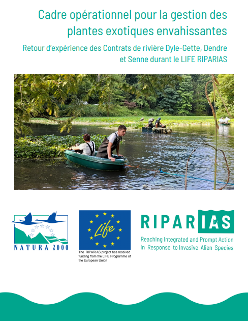 Le projet LIFE RIPARIAS vise à optimiser la gestion des EEE en encourageant la récolte de données scientifiques fiables, la concertation entre partenaires et l’établissement de stratégies de gestion. Ce projet s’étend sur 3 bassins versants en Belgique (Dyle, Senne et Marcq) et vise notamment 22 espèces de plantes exotiques envahissantes parmi lesquelles 9 sont rivulaires et 13 sont principalement aquatiques. Ces 22 espèces peuvent également être catégorisées comme soit « répandues » à l’échelle de la zone du projet, soit « émergentes ». Les cinq espèces considérées comme répandues à l’échelle de la zone du projet sont : la Balsamine de l’Himalaya (Impatiens glandulifera), la Berce du Caucase (Heracleum mantegazzianum), le Myriophylle du Brésil (Myriophyllum aquaticum), la Jussie à grandes fleurs (Ludwigia grandiflora) et l’Hydrocotyle fausse-renoncule (Hydrocotyle ranunculoides).